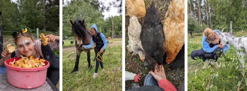Förutom att träna och sköta om djuren kommer vi leka, äta god mat och bada om vädret är fint. För dom som vill övernatta på gården finns bäddar i delat sovrum i huset. Vi ordnar med Frukost, Lunch, Middag och Kvällis.