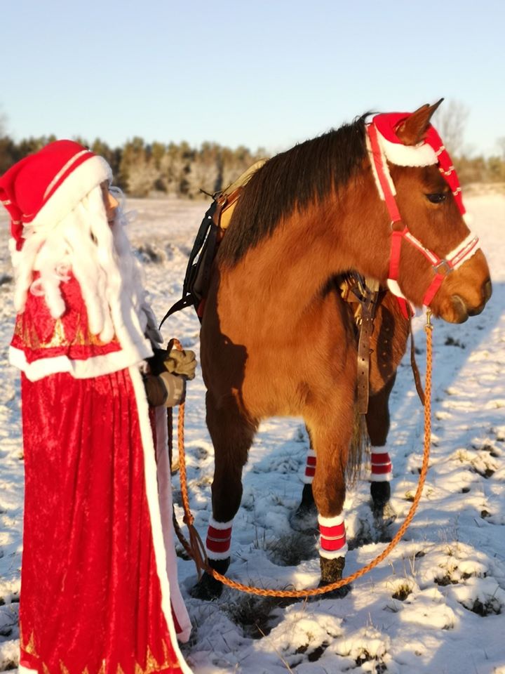 Vi kommer gärna till ert hem och delar ut barnens klappar från väskan på hästen och ger barnen möjligheten att få klappa Rudolfinas mjuka päls och mata henne med julemorötter.